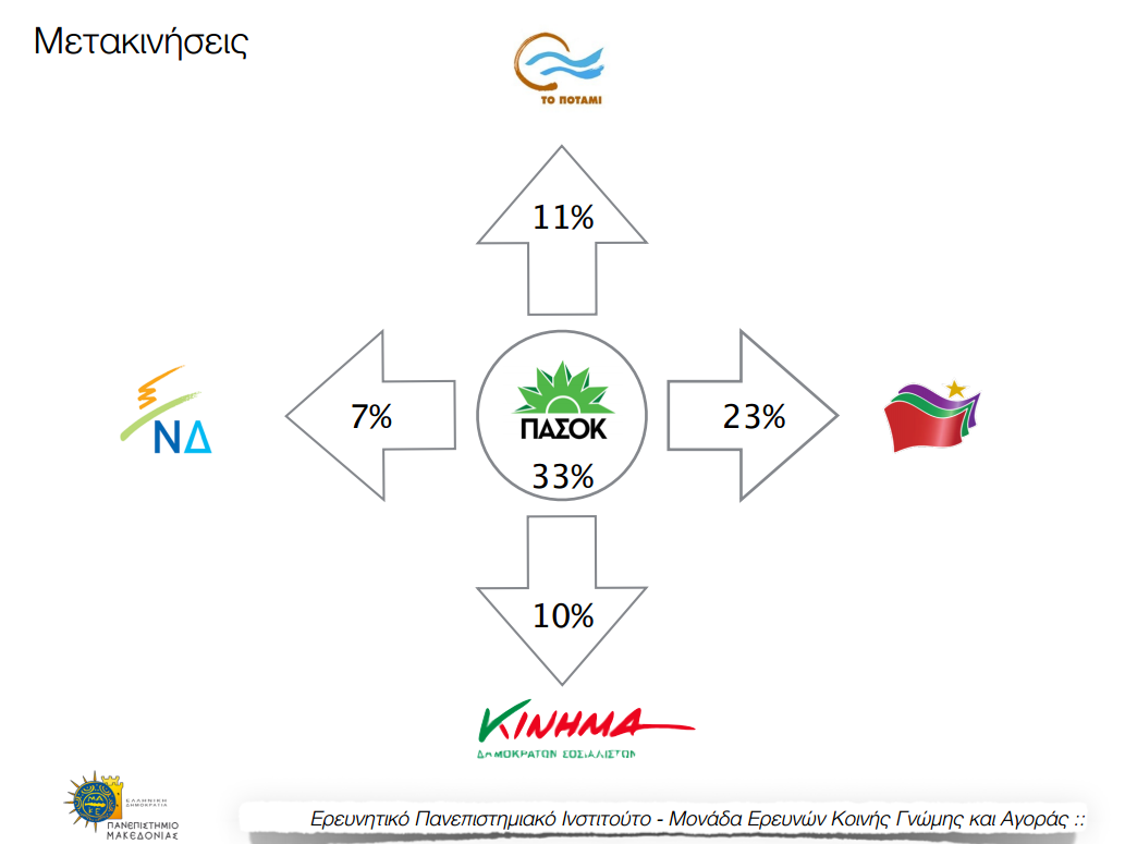 Det mest intressanta med undersökningen har sparats till sist: väljarströmmarna. De är relativt starka. Det gäller kanske framför allt de mindre partierna. I synnerhet är PASOK drabbat: 23% av partiets väljare har gått till SYRIZA, 11% till To Potami, 7% till Ny Demokrati samt 10% till Papandreous nybildade parti Kinima. Denna sistnämnda siffra ger stöd till uppfattningen att PASOK och Kinima hamnar i en situationen då de stjäl röster från varandra. Den socialdemokratiska partisplittringen är ett problem för båda partier.
