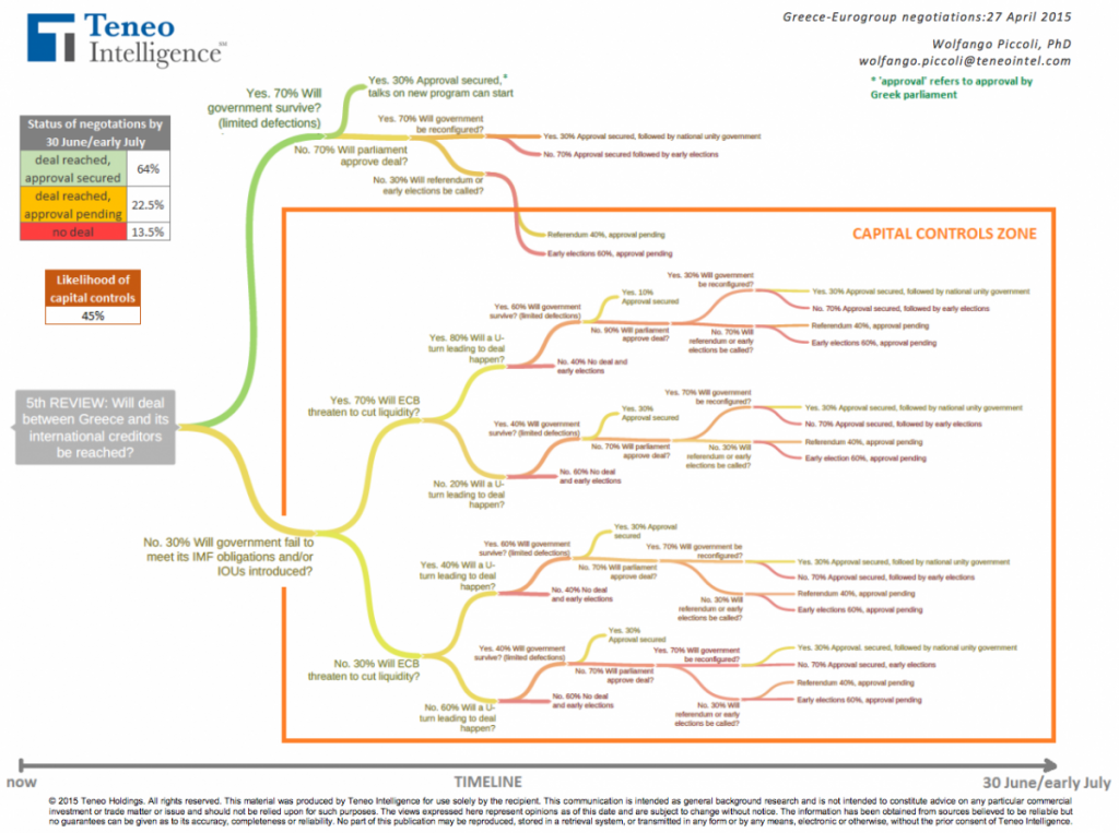 Wolfgang Piccoli är den som för Teneo Intelligences räkning har tagit fram kartan. Piccoli själv uppskattar att sannolikheten att parterna når en överenskommelse senast juli till 64%. När det gäller sannolikheten att kapitalkontroller införs (det vill säga ett slags förstadium i en process som kan sluta med en grexit) uppskattas sannolikheten till 45%.