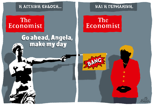 (En fyndig sketch av Dimitris Hantzopoulos, 30.1.2015. I bilden till vänster står det "Den engelska editionen" och i bilden till höger "och den tyska")