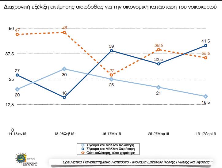 Siffrorna som publicerades av Skai igår är tydliga: väljarna ställer sig allt mer pessimistiska när det gäller de ekonomiska utsikterna för Grekland: 41,5% tror att det kommer att bli värre framöver. Samtidigt har de som ser positivt på de ekonomiska utsikterna nästan halverats jämfört med noteringen i februari: 16,5% tror att det kommer att bli bättre framöver.