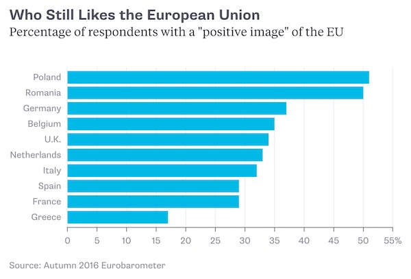 Det är dock samtidigt svårt att avfärda talet om en Grexit som grundlöst. Samma mätning visar på att stödet för euron har sjunkit över tid. Drachmans förespåkare kan sägas få allt mer vatten på sin kvarn. Denna trend sammanfaller dessutom med en trend där stödet för EU blir allt svagare. En mätning som Eurobarometern visar nämligen att knappt 17% har en positiv uppfattning om EU.
